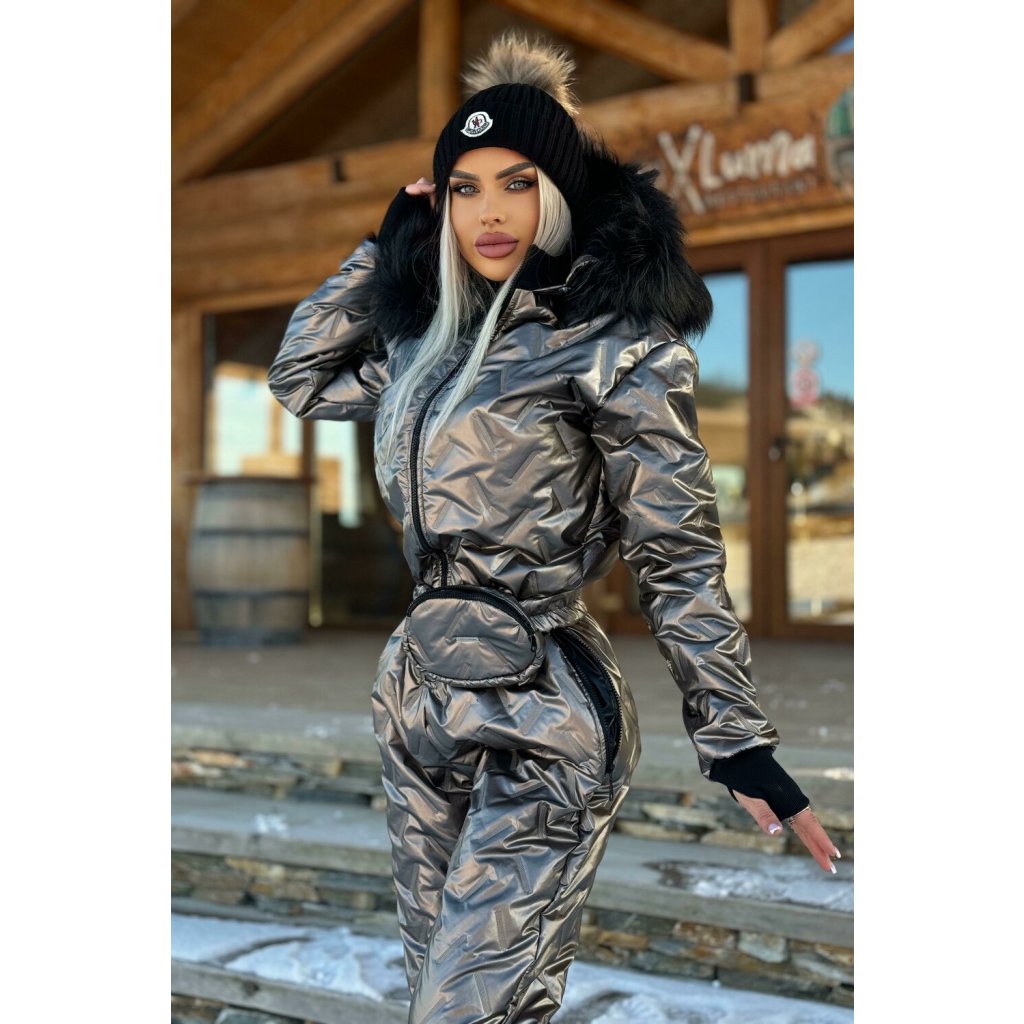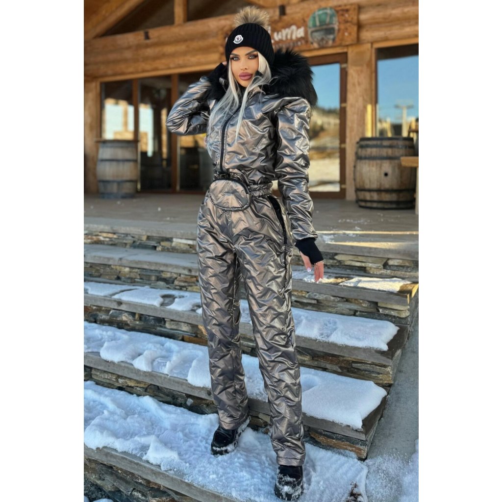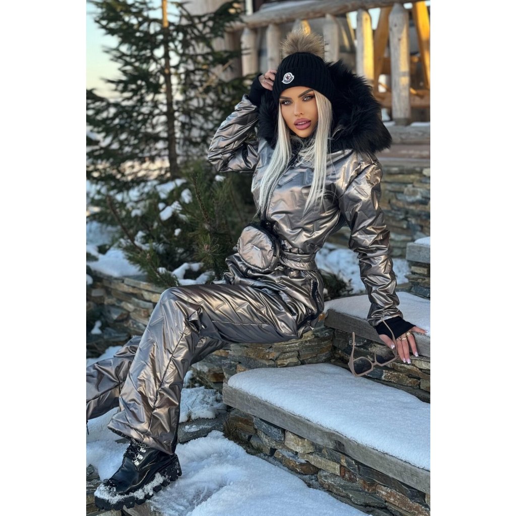 Dámsky metalický lyžiarsky overal cappuccino ktorý svojim priliehavým strihom dokonale zdôrazňuje ženskú siluetu. Kvalitný zimný prešívaný overal s kapucňou ktorá Vás ochráni pred vetrom. Kapucňa je lemovaná umelou kožušinou ktorú si môžete ľahko pripnúť alebo odopnúť. Tento overal na lyžovanie je vyrobený z vodeodolného materiálu. Vpredu je overal so zapínaním na zips. 2 klasické vrecká na zips. Rukávy sú ukončené trendy návlekmi. Súčasťou overalu je aj praktická ľadvinka na zips ktorá je odopínateľná a môžete ju využiť aj v iných outfitoch.