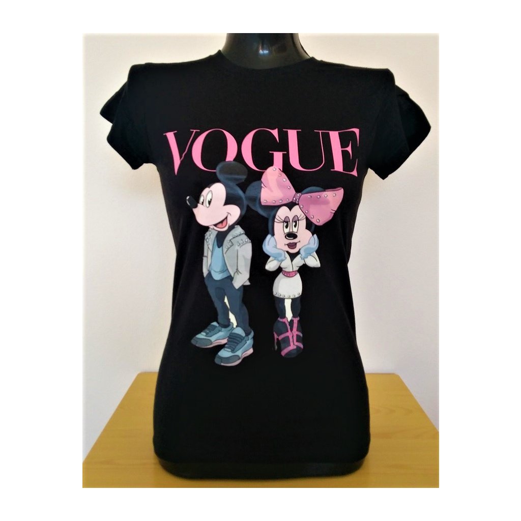 Bavlnené dámske čierne tričko DISNEY s krásnou potlačou vpredu- minnie a mickey mouse. Tričko s krátkym rukávom ozvláštnené ružovým nápisom ,,VOGUE,, Príjemný bavlnený materiál.
