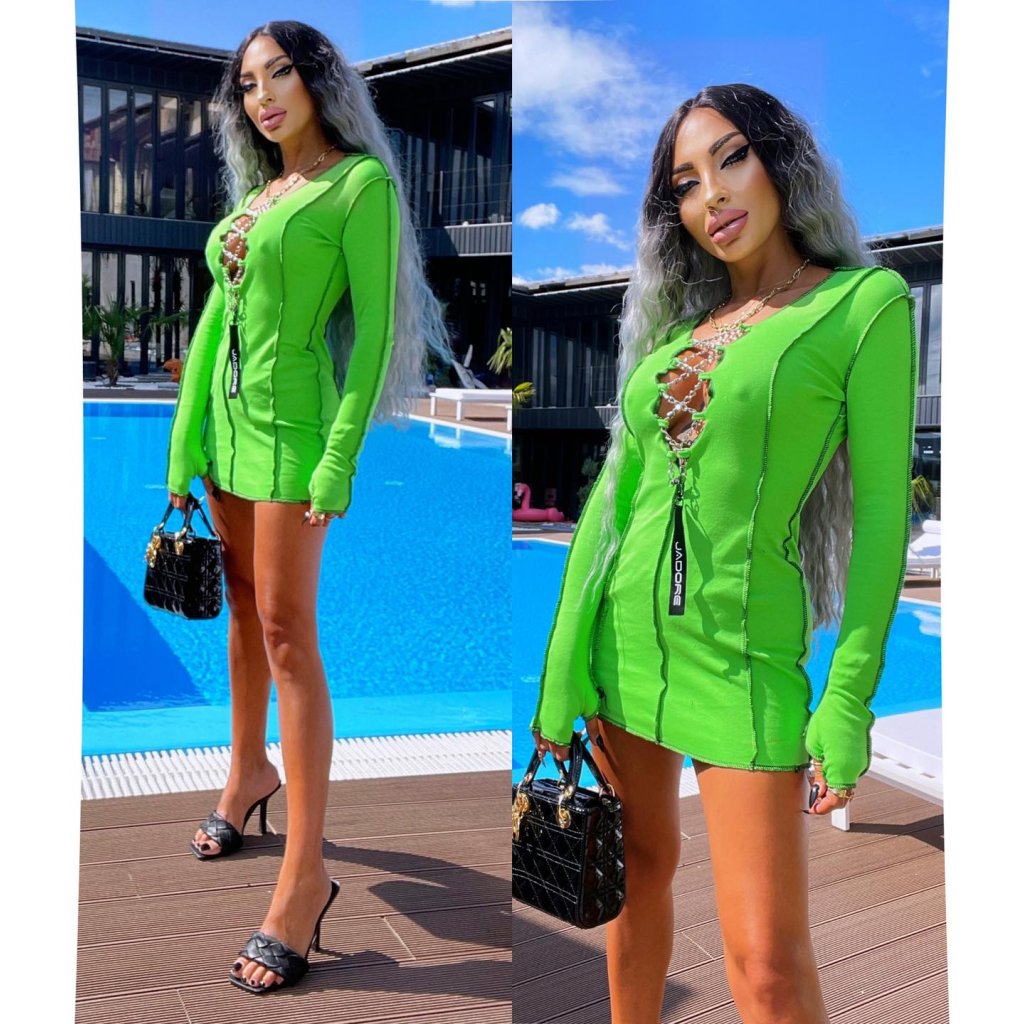 Hľadáte zelené mini šaty s dlhým rukávom ktoré Vám perfektne sadnú na postave a zvýraznia vašu krivky? Tak tieto sú pre Vás ako stvorené. Krátke letné šaty so šnurovaním na prsiach, sú zdobené krásnou retiazkou. Tieto šaty na leto s hlbokým výstrihom sú vyrobené z elastického materiálu.