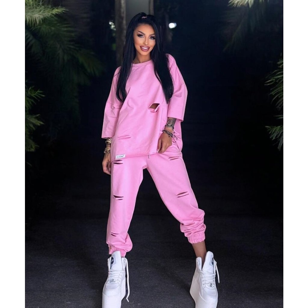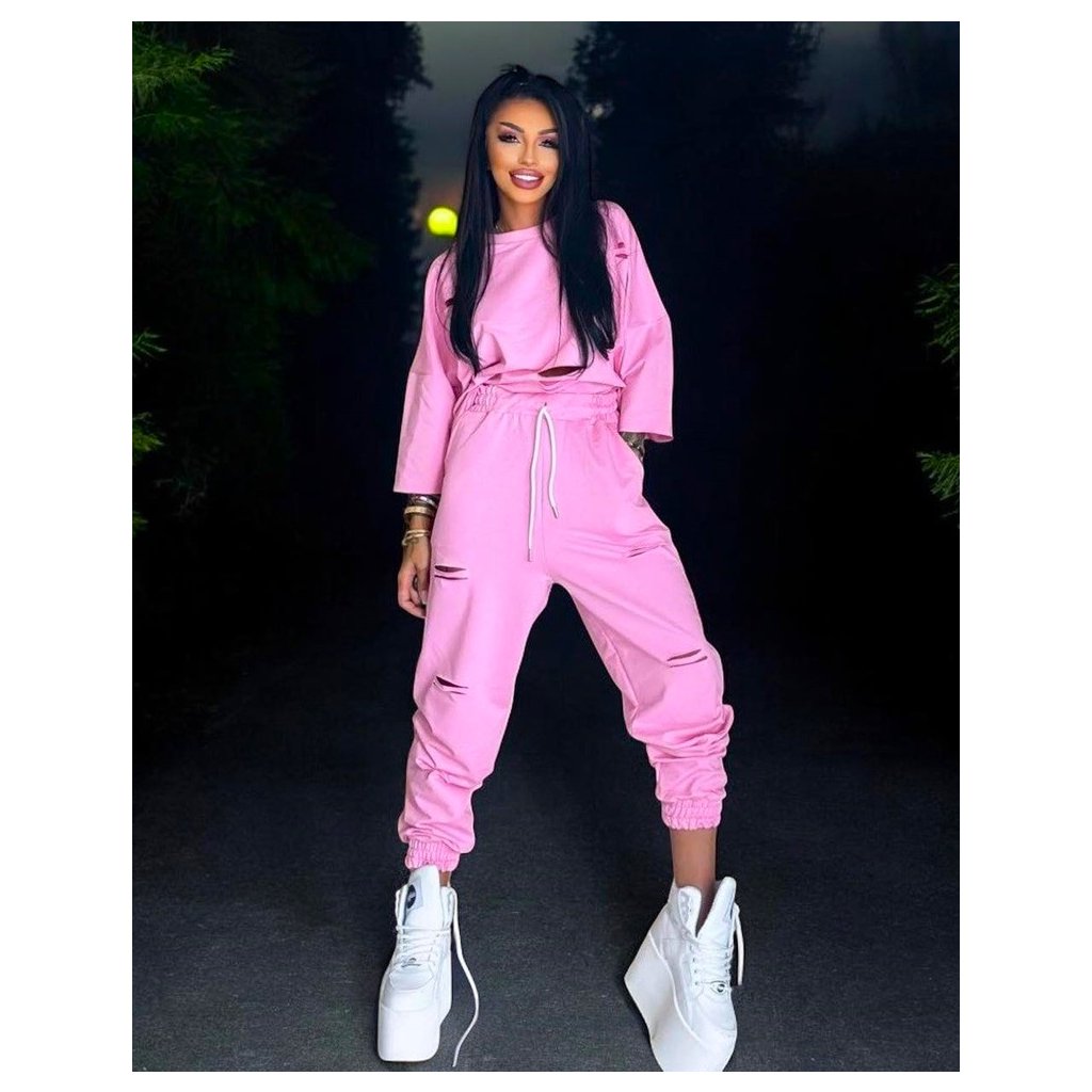 Ste milovníčkou súprav? Vaša obľúbená farba je ružová? Máte radi oversize strih? Tak táto dámska ružová bavlnená súprava je určená práve pre Vás. Moderná dvojdielna potrhaná súprava s 3/4 rukávom ktorá sa skladá z predĺženej mikiny a voľných teplákov s vysokým pásom ktoré si môžete prispôsobiť šnúrkou v oblasti pásu.