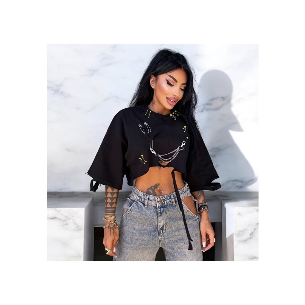 Moderný dámsky čierny voľný crop top ktorý je neprehliadnuteľný vďaka retiazke a štýlovým zicherkám vpredu. Tento oversize crop top má zaujímavé prestrihané rukávy. Zicherky sú v striebornej a zlatej farbe. Tento top si rýchlo obľúbite pre jeho moderný dizajn a voľný strih. Krátky rukáv. Univerzálna veľkosť UNI XS/S/M/L.