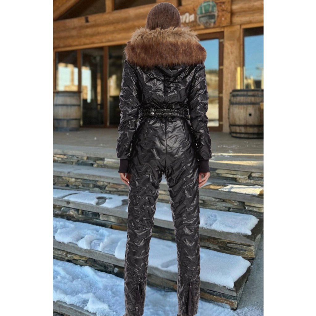Štýlový dámsky lyžiarsky overal v krásnej metalickej čiernej farbe ktorý svojim priliehavým strihom dokonale zdôrazňuje ženskú siluetu. Kvalitný zimný prešívaný overal s kapucňou ktorá Vás ochráni pred vetrom. Kapucňa je lemovaná umelou kožušinou ktorú si môžete ľahko pripnúť alebo odopnúť. Tento overal na lyžovanie je vyrobený z vodeodolného materiálu. Vpredu je overal so zapínaním na zips. 2 klasické vrecká na zips. Rukávy sú ukončené trendy návlekmi. Súčasťou overalu je aj praktická ľadvinka na zips ktorá je odopínateľná a môžete ju využiť aj v iných outfitoch.