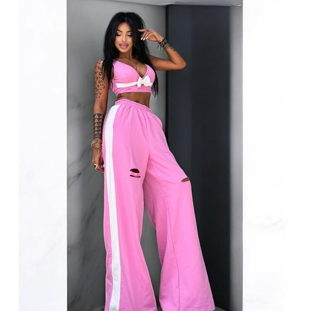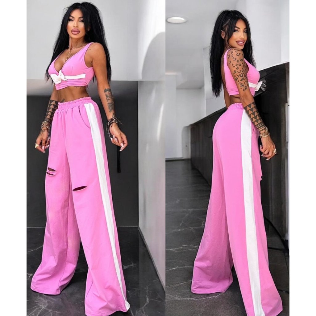 Rozkošná dámska bavlnená súprava s mašľou vpredu v modernom prevedení v krásnej cukríkovej ružovej farbe. Súprava pozostáva z 2 dielov. Štýlový ružový crop top na ramienka, pod prsiami zdobený bielou mašľou. Top má hlboký výstrih vpredu aj vzadu. Široké voľné ružové tepláky s elastickou gumou v páse. Tepláky s bielymi pásmi na bočných stranách. Tepláky majú 2 klasické vrecká. Súprava vhodná aj na vyššiu postavu.
