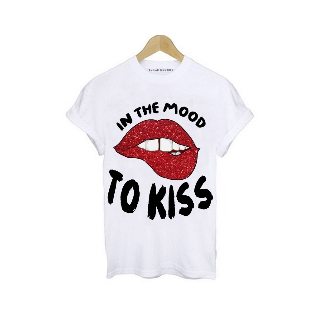 Pohodlné dámske biele tričko s krátkym rukávom ktoré Vám zaručí komfort počas celého dňa. Vyrobené je zo 100% bavlny ktorá je príjemná na dotyk. Tričko s potlačou vpredu zdobené nápisom,,In the mood to kiss,, a červenou pusou.